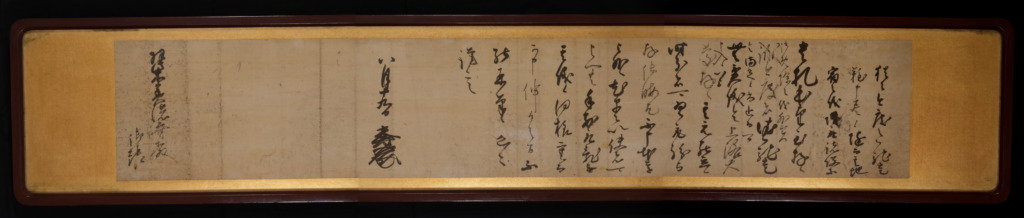 危機を乗り越えた教如上人と8代目住職「明玄」は、岐阜の地を立ち、無事に帰洛することができます。京に戻り、安堵した教如上人は岐阜で便宜を図ってくれた織田秀信にお礼状をしたため、明玄にもたせ、織田秀信に渡すように頼みます。